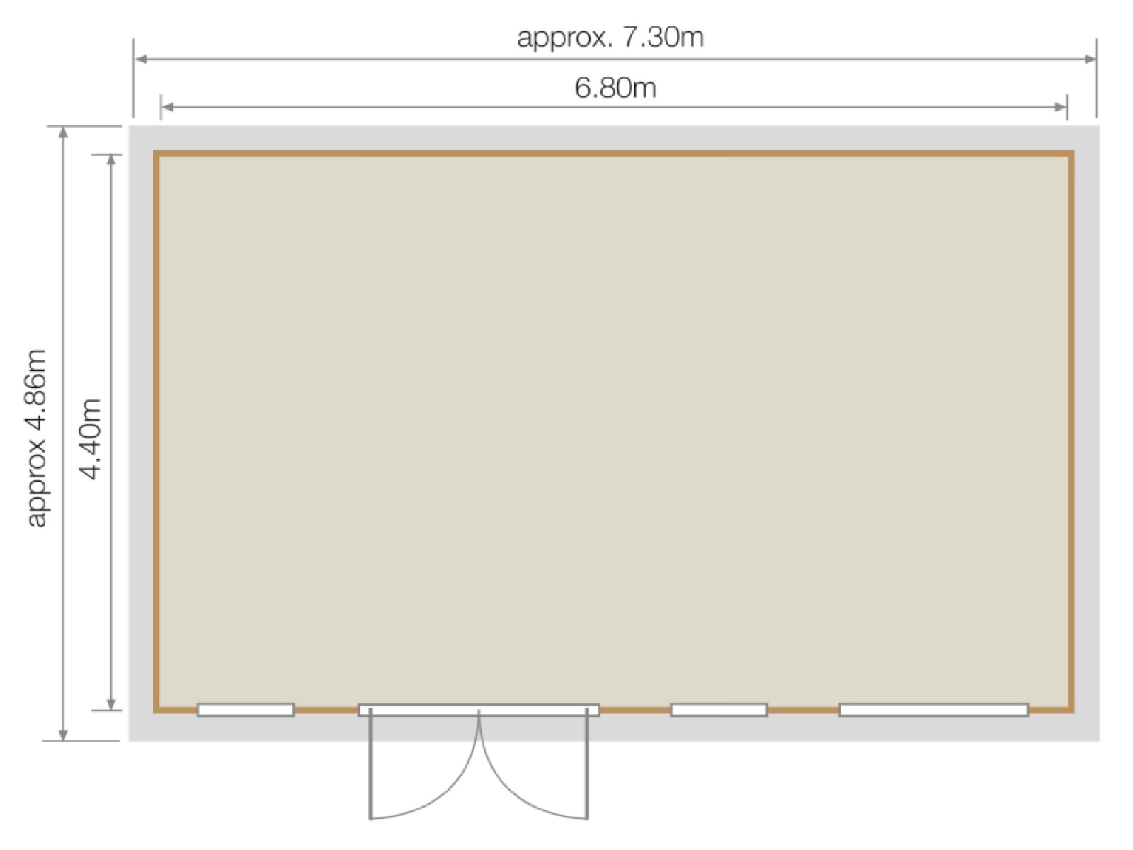 6.80m x 4.40m. This is the largest of our modern studio/contemporary style log cabins. Single room log cabin a wall log thickness of 44mm.