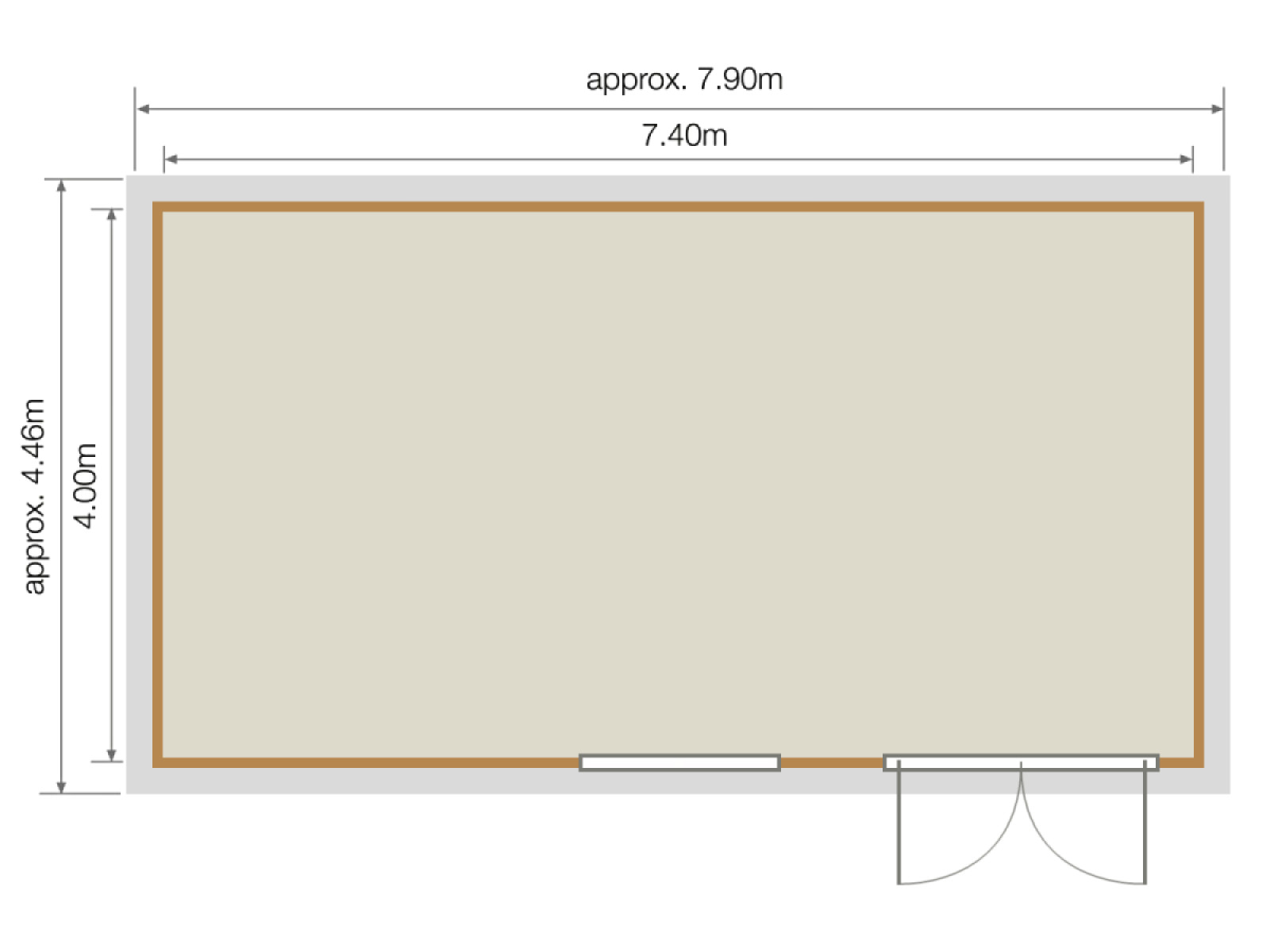 7.40m x 4.00m. Single room log cabin with a 44mm wall log thickness. Ideal for a home gym, cinema workshop or golf simulator.